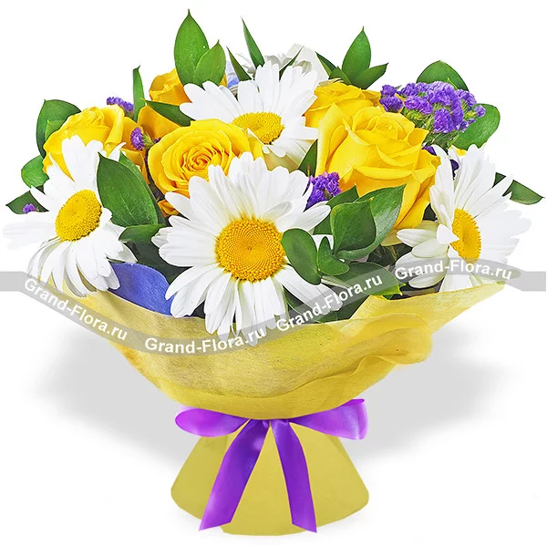 ЛЮКС: ромашка белая - 11 шт, роза желтая - 10 шт, статица - 5 шт, рускус, фетр желтый, бант фиолетовый.